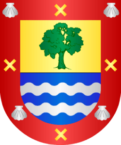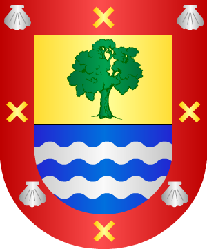 Ucelay: Cortado 1º: En oro, un fresno de sinople. 2º En azur, con dos fajas, ondeadas, de plata. Bordura, general de gules, con cuatro veneras de plata y cuatro sotueres de oro, alternando.
