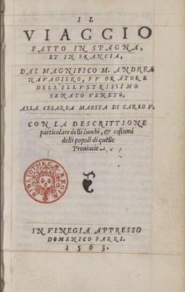 Portada original de Il Viaggio fatto in Spagna et in Francia de Andrea Navagero, en su primera edición italiana de Domenico Farri, 1563. La imagen corresponde al ejemplar procedente de la Biblioteca Real, de Francia.