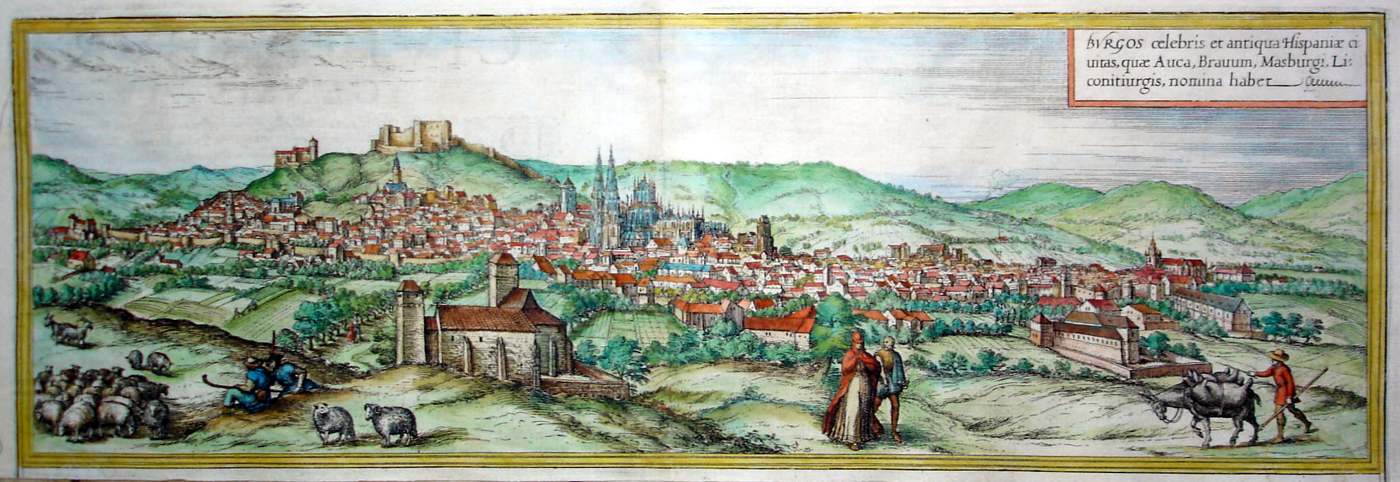 Burgos celebris et antiqua Hispaniae ciuitas… Grabado en torno al año 1600 basado en un dibujo de Jorris Hoefnagel. Procede de la obra de G.Braun & F. Hogenberg, Civitates Orbis Terrarum, tomo I.
