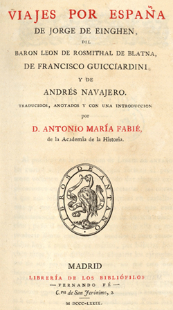 Primera edición en español de El Viaje por España de Navagero, debida a Antonio María Fabié y publicada, en mismo volumen que otros relatos de viajeros extranjeros, en Libros de Antaño de la Librería de los Bibliófilos (1879).