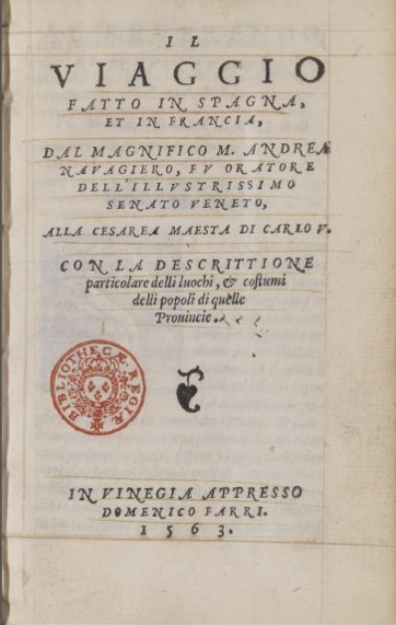 Portada original de Il Viaggio fatto in Spagna et in Francia de Andrea Navagero, en su primera edición italiana de Domenico Farri, 1563. La imagen corresponde al ejemplar procedente de la Biblioteca Real, de Francia.