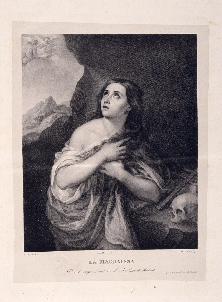 Escuela de Murillo / 60. La Magdalena / Con las manos cruzadas al pecho y sujetando el paño rosado que la cubre el cuerpo, levanta los ojos al cielo y lloraen el desierto sus pasados extravíos. Fondo, gruta; a la derecha sobre una piedra un libro con una cruz y una calavera, a la izquierda un trozo de celaje y un resplandor de gloria, con ángeles que tocan diversos instrumentos / Alto 4 pies, 6 pulg.; ancho 3 pies, 6 pulg., 6 lin.