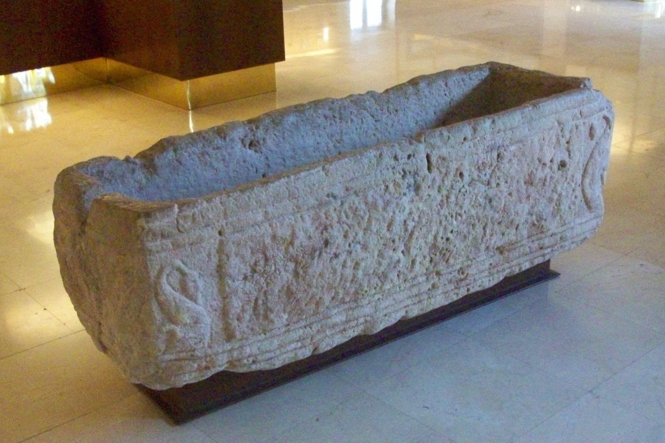 Vista longitudinal de sarcófago de Poza, en la que pueden apreciarse las hendiduras realizadas para su uso como pilón para las caballerizas (Museo de Burgos).