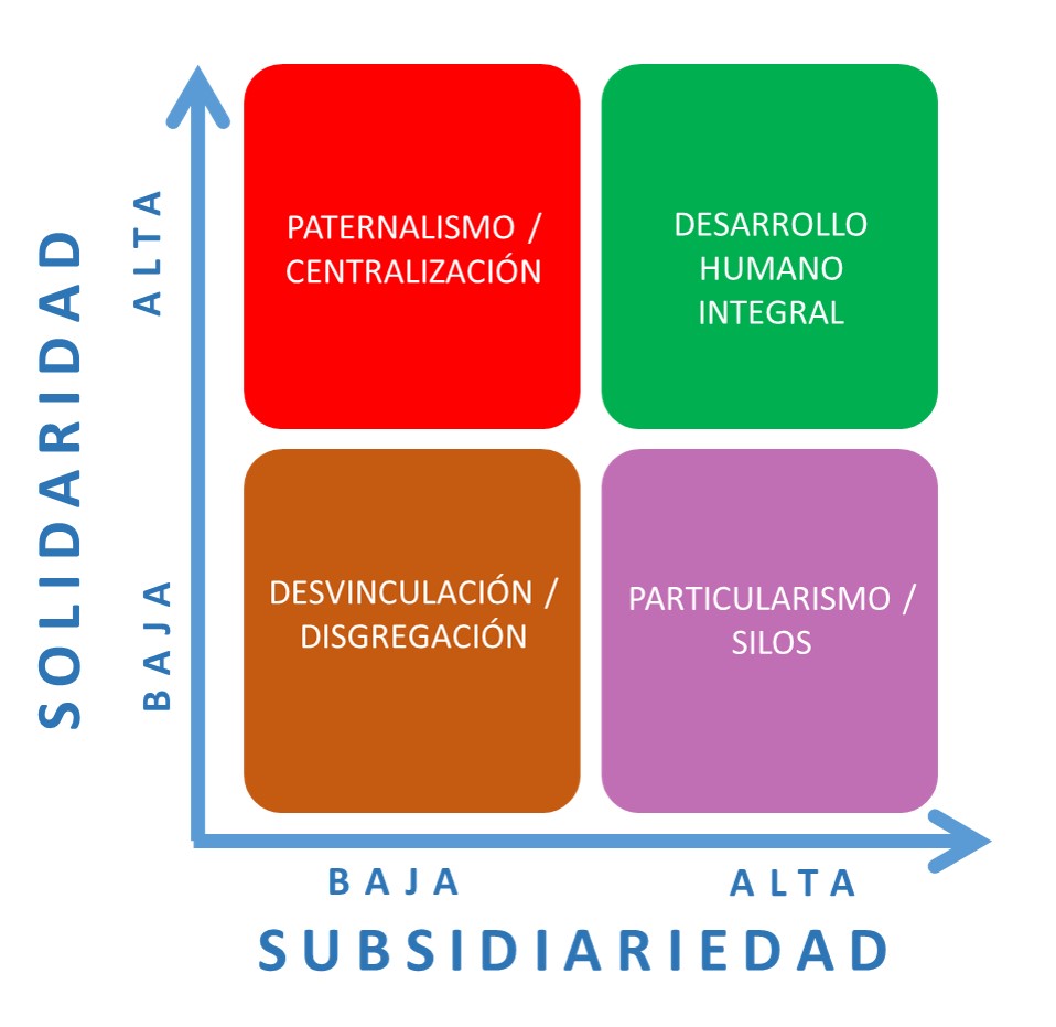 La siguiente matriz explica bien la complementariedad entre subsidiariedad y solidaridad así como su mutuo enriquecimiento. La solidaridad, en fin, hace emerger la dimensión social de la persona, mientras que la subsidiariedad hace florecer la dimensión personal de las sociedades.