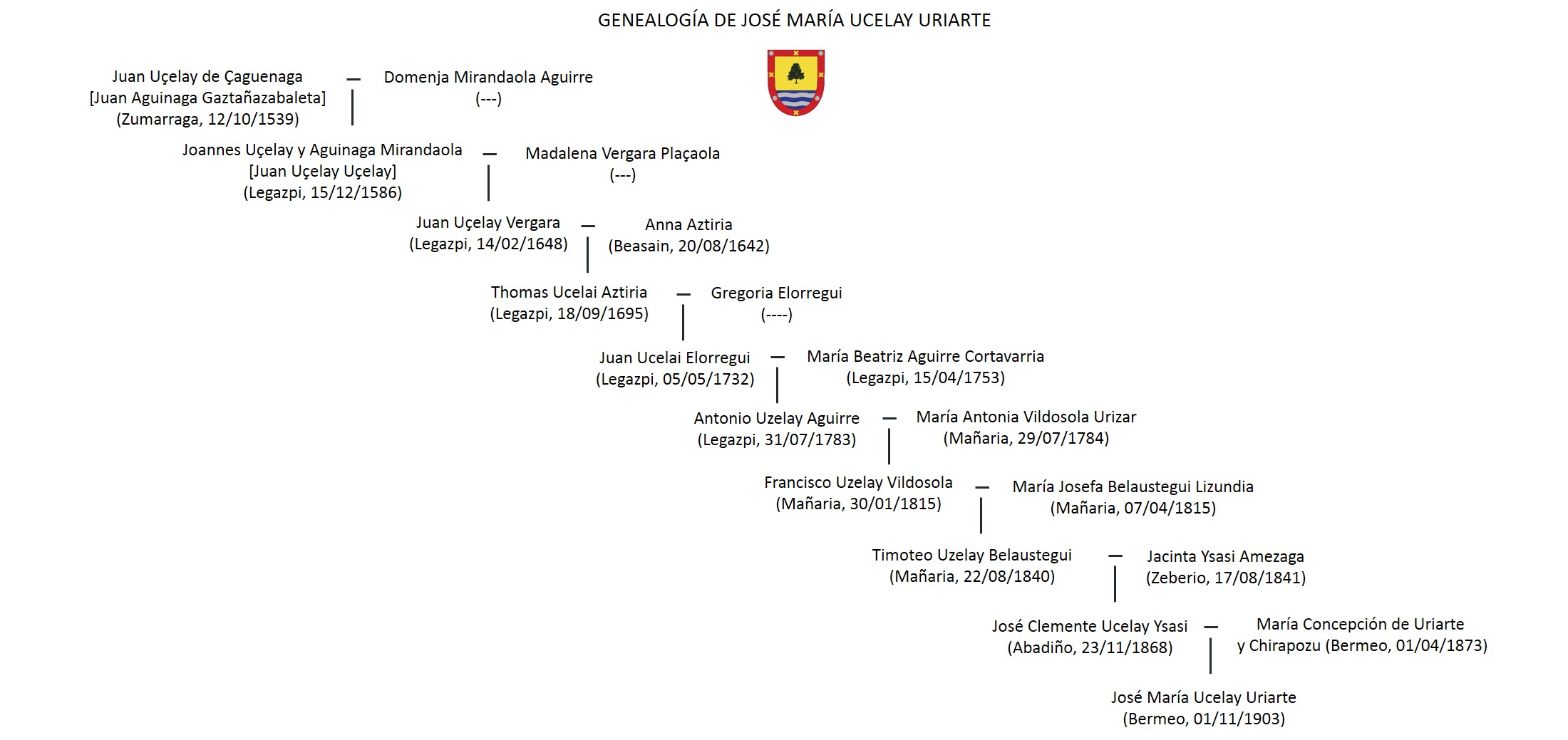 En 1586 encontramos a los ancestros del pintor en Legazpi, Guipúzcoa, donde su rama familiar permanece hasta que Antonio Uzelay Aguirre pasa a Mañaria (Vizcaya), donde había sido bautizada su esposa María Antonia Vildosola Urizar. Y, como ya sabemos, el padre de José María Ucelay, José Clemente Ucelay Ysasi, fue bautizado tres generaciones después, en 1868, muy cerca: en Abadiño (Vizcaya).