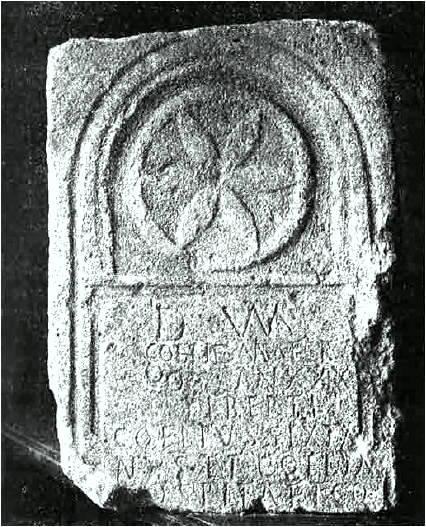 Fragmento de estela funeraria -con epigrafía latina- extraído en 1915 de los muros de la Ermita de la Virgen de Pedrajas, en Poza de la Sal, al que se refirió el P. Enrique Herrera en su conferencia. En la actualidad se encuentra frente al Retablo de la Virgen del Rosario de la Iglesia parroquial de San Cosme y San Damián. La foto que aquí se presenta fue realizada por el propio P. Herrera y publicada por Fita en el Boletín de la Real Academia de la Historia (T. LXVIII, 1916).