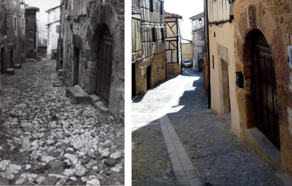 A la izquierda, imagen antigua de una de las características calles empinadas y empedradas de Poza de la Sal. Esta, en concreto, es la calle de Las Cercas, vista desde la parte alta del pueblo, un poco más arriba de la Puerta de las Eras (Foto: Fede). A su lado, la misma calle en la actualidad.