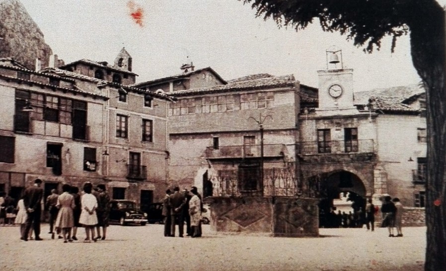 La Plaza Nueva de Poza de la Sal a mediados del siglo pasado. En el centro, el icónico quiosco de música, sustituido no hace mucho por uno nuevo, algo mayor (Foto: Antonio Tamayo)