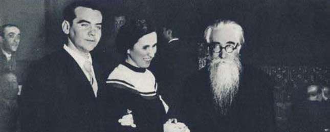 Pura Ucelay -Pura Maórtua Lombera- flanqueada por Federico García Lorca y Ramón María de Valle-Inclán en el en el preestreno de Yerma, Madrid, 1934