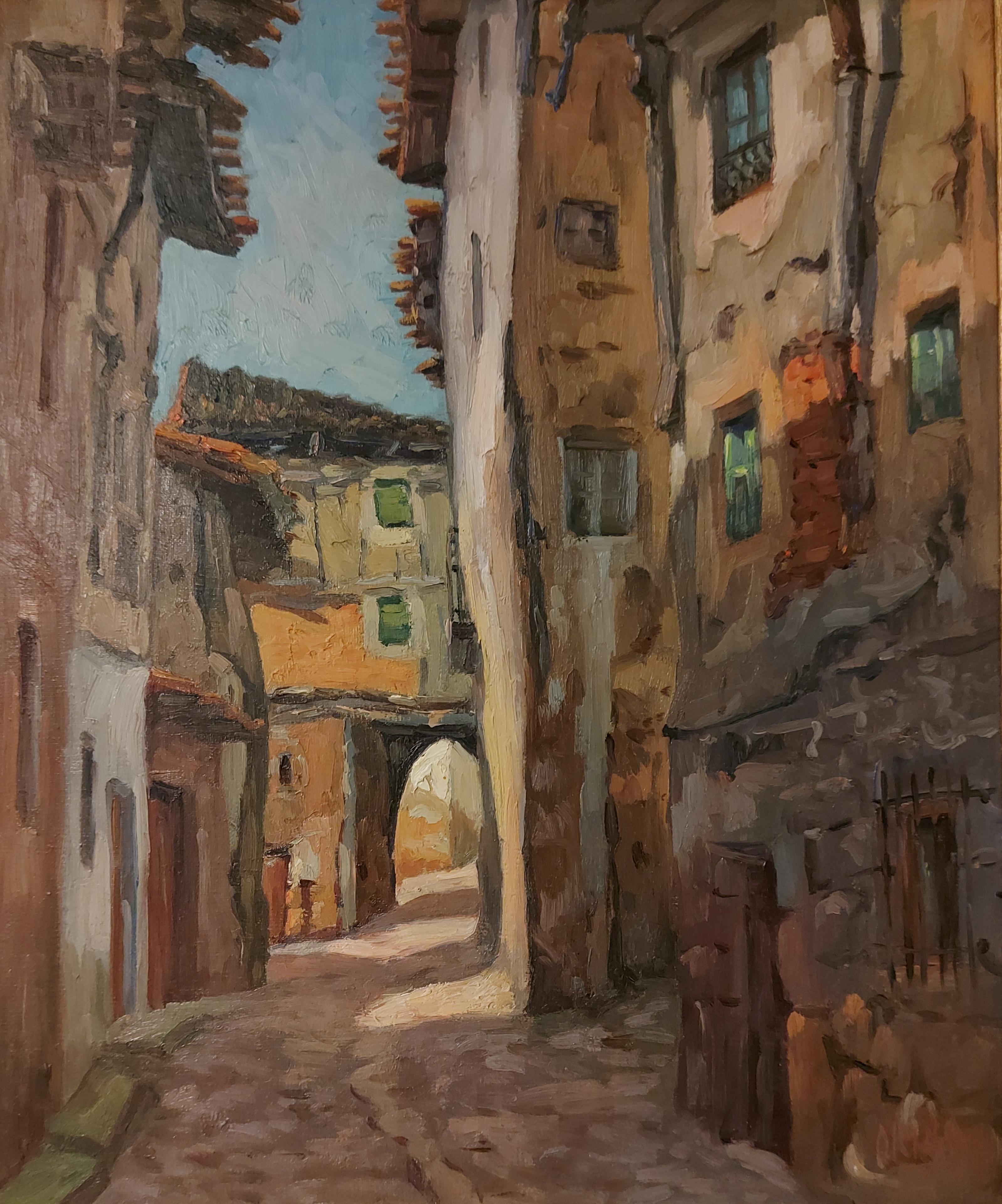 En primer lugar, el bergarés Miguel Okina, pintor maduro, autor de la interesante vista de la Puerta de las Eras desde la calle La Torre que acompaña estas líneas.
