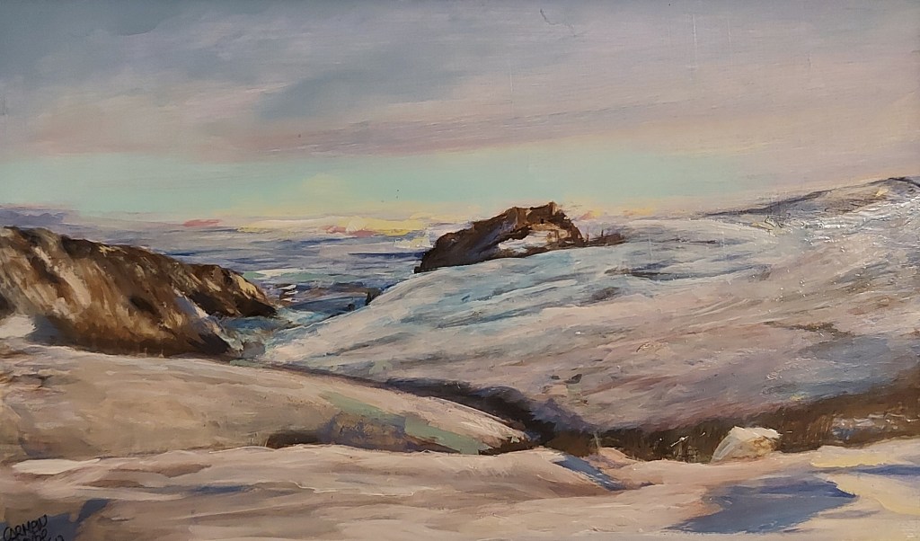 Finalmente, la pintora Carmen Gorbe, a alguna de cuyas asombrosas creaciones hiperrealistas ya he dedicado anteriormente una entrada en este blog, y de la aquí traigo un óleo, de muy diferente técnica, con un evocador paisaje invernal del Rusalado, con el castillo de los Rojas al fondo.
