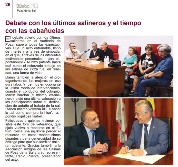 Mi felicitación a quienes hicieron posible este foro de veteranos, que ojalá vuelva a repetirse en el futuro. Sería una injusticia perder el recuerdo de estos modestísimos gigantes y de la generosidad de su entrega para que sus familias salieran adelante. Gracias también a la Asociación Amigos de las Salinas de Poza de la Sal y al presentador del acto, Pablo Puente.