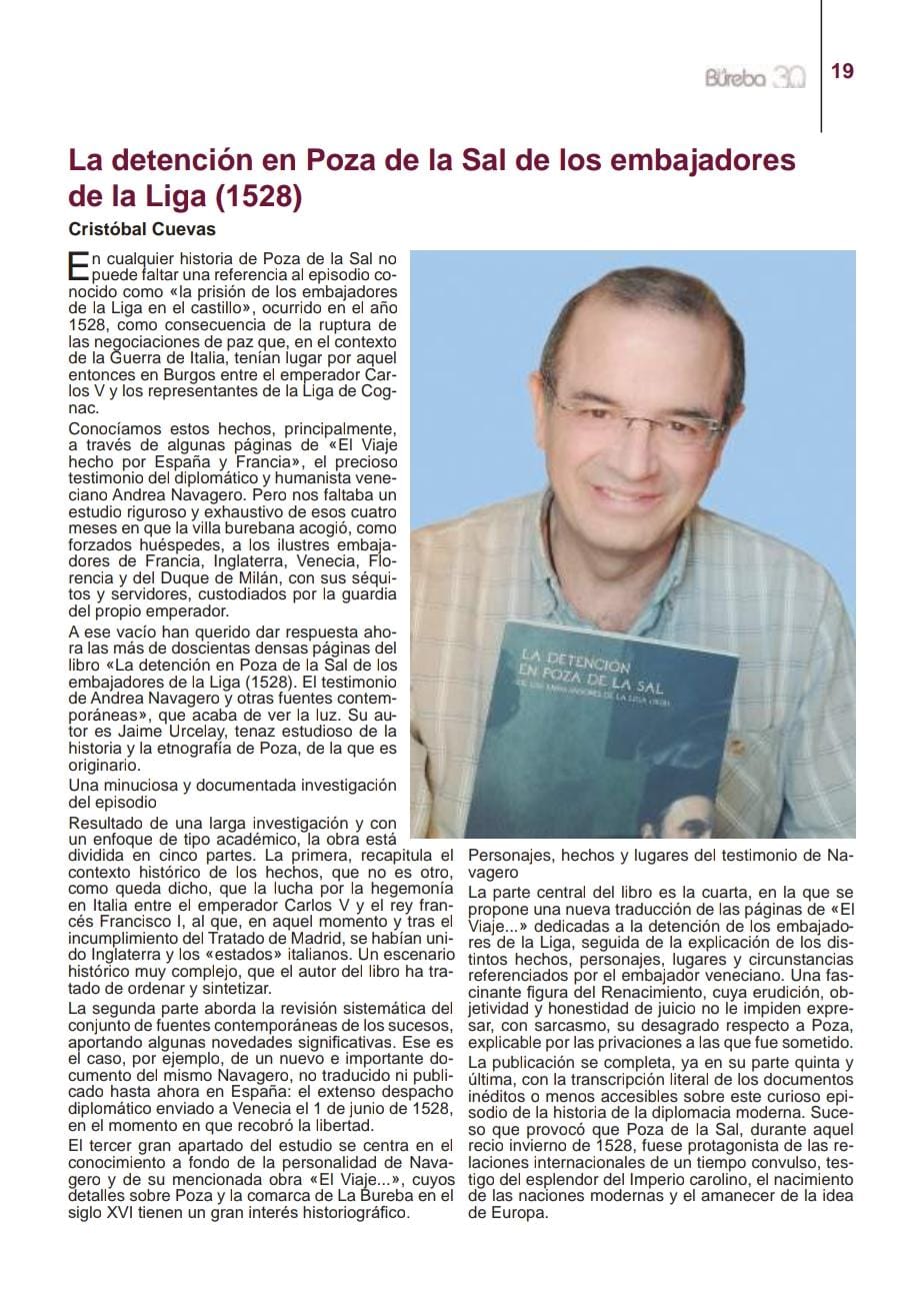 Agradezco mucho a Cristóbal Cuevas y a La Bureba 30 Días, periódico de la comarca burgalesa del mismo nombre, la atención en el último número al libro «La detención en Poza de la Sal de los embajadores de la Liga (1528)», que acabo de publicar.