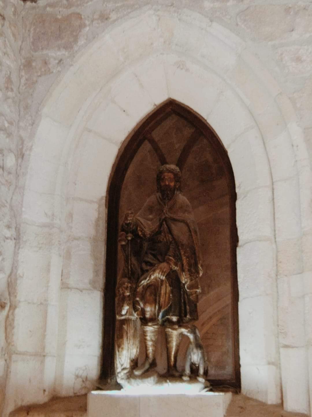 Lamentablemente, la talla de San Roque de la iglesia parroquial, además de escasamente visible por su mala ubicación, se encuentra en un pésimo estado de conservación. Su oscurecimiento por acumulación de polvo y humo de las velas y su pérdida cromática, apenas permiten apreciar su calidad y belleza. La foto adjunta, pese a la dificultad para realizarla, permite hacerse una idea de lo que digo.
