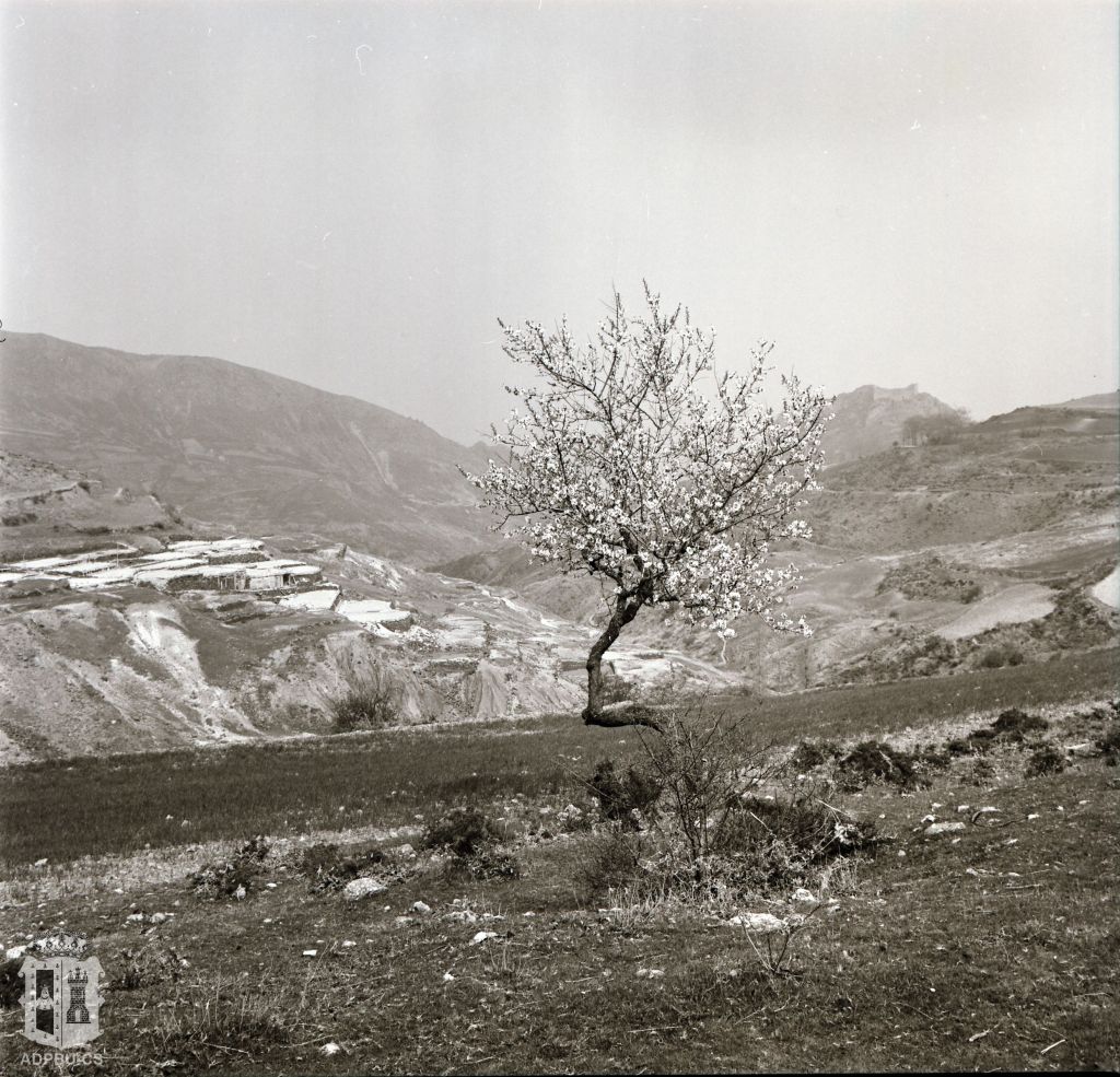 6. Cirilo Saiz: «Árbol en flor en Poza de la Sal, al fondo las salinas». Fecha: 01/05/1963 (ADPBU – CS – 00570).