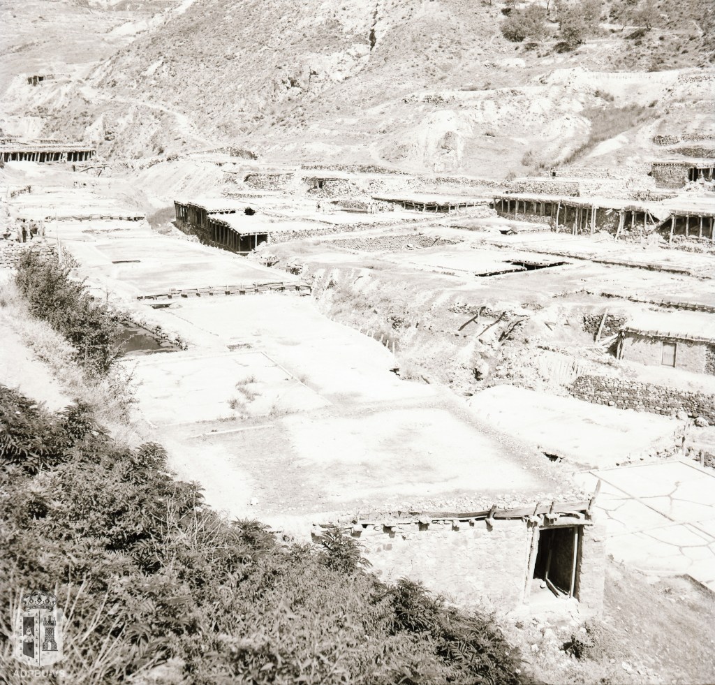 El salinero Máximo Ruiz (“el Hornero”), de espaldas, riega la era en el granjerío de zona sur del valle de Rusalado, la más próxima a la carretera del Páramo. Son bien visibles el pingoste y dos arquetones o depósitos intermedios para la muera. En primer plano, un pozo completamente vacío, señal de que se trata ya del declive final de las salinas pozanas. En algunos de los chozones y eras de la zona norte, al otro lado de La Torca, se aprecian también derrumbes.