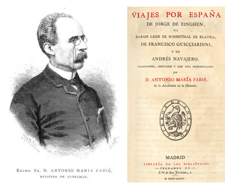 Nuestra edición nacional aún tardaría en ver la luz. Fue publicada en el año 1879 como resultado de un meritorio trabajo del erudito y político sevillano Antonio María Fabié Escudero (Sevilla, 1832 – Madrid, 1899), quien integró la traducción de El Viaje -exclusivamente la parte dedicada a España- en un volumen más amplio titulado Viajes por España de Jorge de Einghen, del barón de Rosmithal, de Francisco Guicciardini y de Andrés Navajero6.