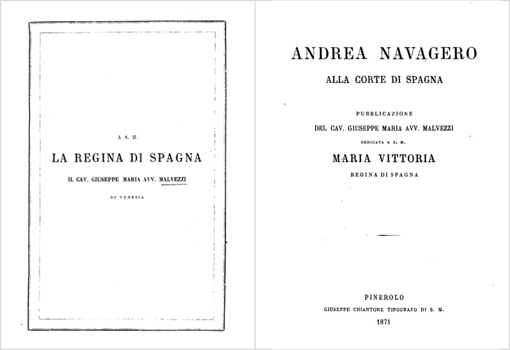 Giusseppe María Malvezzi (Venecia, 1816 –1884), otro notable historiador veneciano, se hizo eco pocos años después de la obra de Cicogna, publicando en 1871 el librito Andrea Navagero alla Corte di Spagna8, dedicado a nuestra desconocida reina consorte María Victoria del Pozzo, esposa del efímero rey de España Amadeo de Saboya. El contenido de la obra se limita, prácticamente y si exceptuamos la inicial Noticia histórico-bibliográfica, a la reproducción completa del importante Despacho de 1 de junio de 1528, redactado por Navagero en Bayona tras la liberación del confinamiento forzoso en Poza de la Sal.
