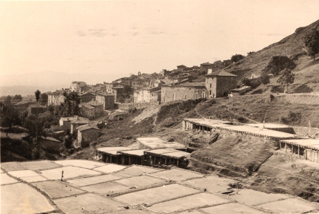 Se trata de una panorámica muy poco común de las salinas pozanas. Solo conocíamos una relativamente similar, aunque menos completa, del archivo de Photo Club, publicada en nuestro citado libro «Poza de la Sal. Retorno al origen» (página 112, imagen 1).