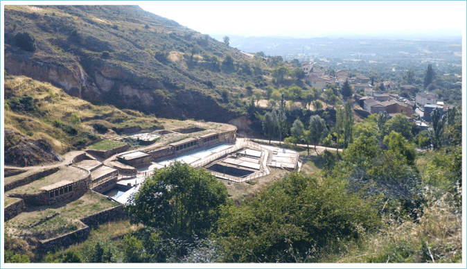 Así podía contemplarse el mismo lugar el 27/07/2025. Las eras del lado norte del valle son las rehabilitadas, mientras que las eras y pozos del lado derecho de la Torca Salada han desaparecido por completo. Se ha ensanchado además notablemente el camino de bajada desde la carretera a las granjas para facilitar el acceso de los visitantes. Aunque apenas se aprecia en la foto, el almacén de sal, construido en tiempos de Felipe II, presenta en la actualidad un lamentable estado de ruina ante el que nada se está haciendo. De poco ha servido, por el momento, su inclusión en la Lista Roja de Hispania Nostra, junto con los almacenes de La Madalena y Trascastro, estos de época de Carlos IV.